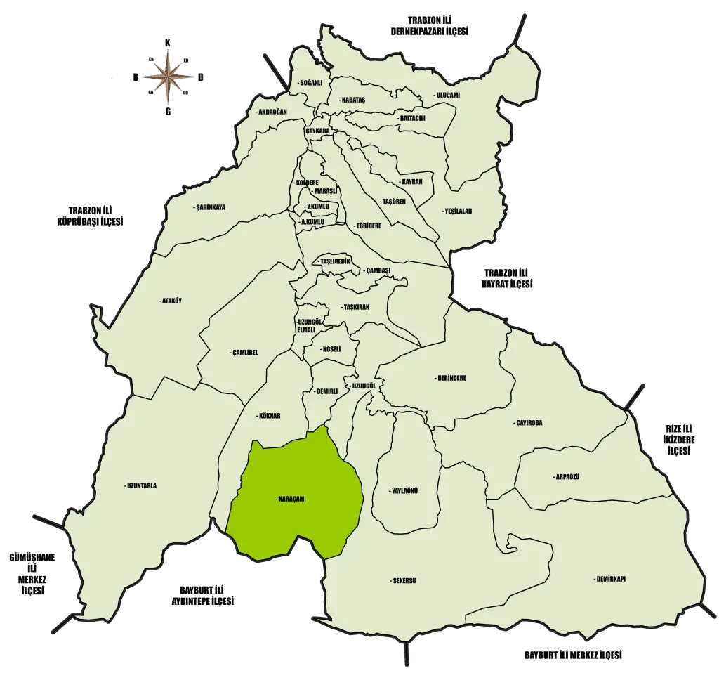 Karaçam Beldesi, köy statüsünden belediye statüsüne geçişini 1969 yılında gerçekleştirmiştir. 2000 yılında 2547 olan nüfusu, 2015 yılında Adrese Dayalı Nüfus Sistemi verilerine göre 1566'ya düşmüştür. Uzungöl'ün doğusunda, Bayburt'a bağlı Kavlatan köyü batısında, Bayburt güneyinde, Köknar köyü ise kuzeyinde konumlanmıştır. Trabzon'a 98, Çaykara'ya 25 km uzaklıktadır ve denizden yüksekliği 1100 metredir. Tarihi Of-Çaykara-Bayburt yolu üzerinde bulunan Karaçam, belediye statüsü kazandığı 1969 yılından bu yana varlığını sürdürmektedir.